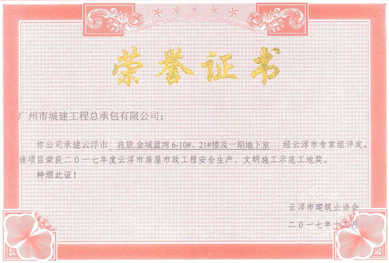 2018年1月,公司金域藍(lán)灣項目喜獲2017年度云浮市房屋市政工程安全生產(chǎn)、文明施工示范工地獎。自金域藍(lán)灣項目開工以來,公司一直不斷加強(qiáng)安全文明管理力度,并成立了專門的督導(dǎo)組,從技術(shù)、現(xiàn)場、協(xié)調(diào)、施工組織等各個方面對項目部進(jìn)行全方位的幫扶指導(dǎo)。為保證施工安全文明目標(biāo)的落實(shí),項目部成立安全文明標(biāo)準(zhǔn)管理小組,制定詳細(xì)方案,由專人負(fù)責(zé)相關(guān)工作的推進(jìn)。