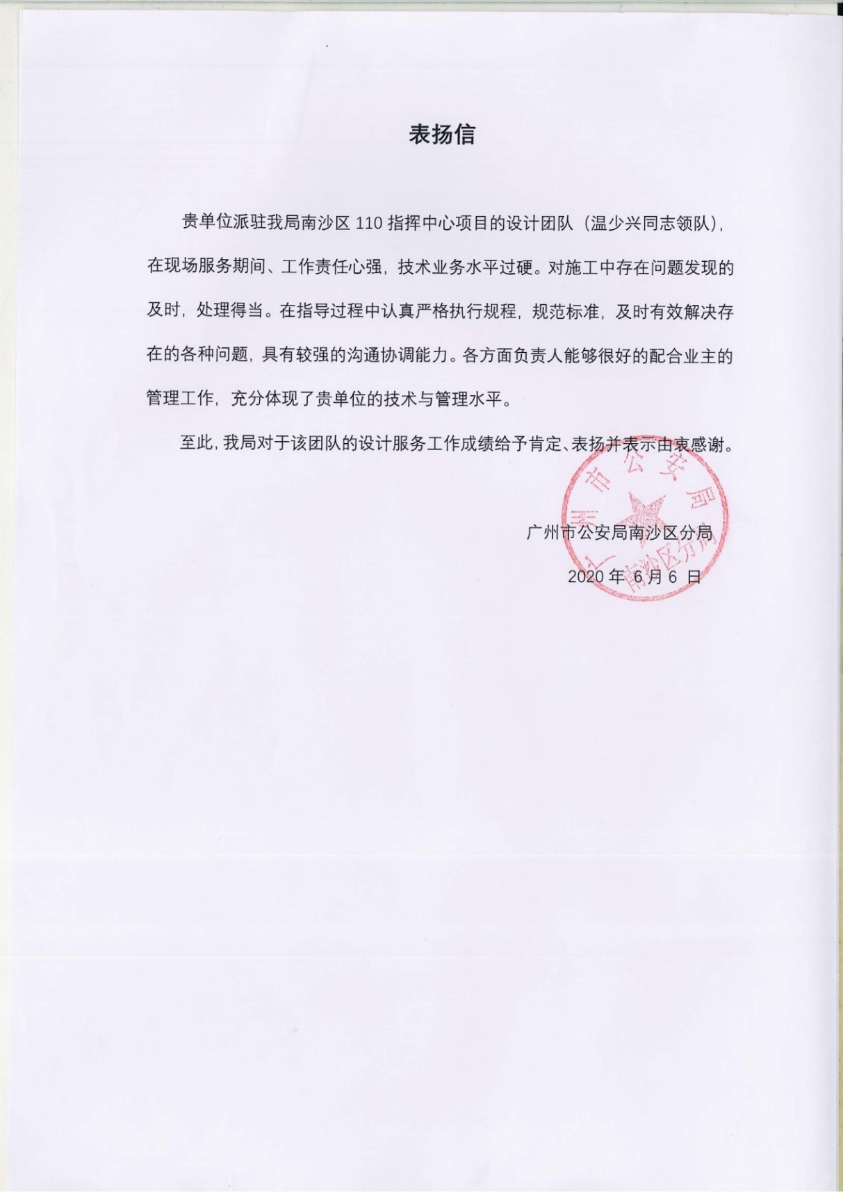 近日,廣州市公安局南沙區(qū)分局送來表?yè)P(yáng)信,對(duì)我公司廣州市南沙公安分局110指揮中心裝修設(shè)計(jì)工程的設(shè)計(jì)團(tuán)隊(duì)給予表?yè)P(yáng)。