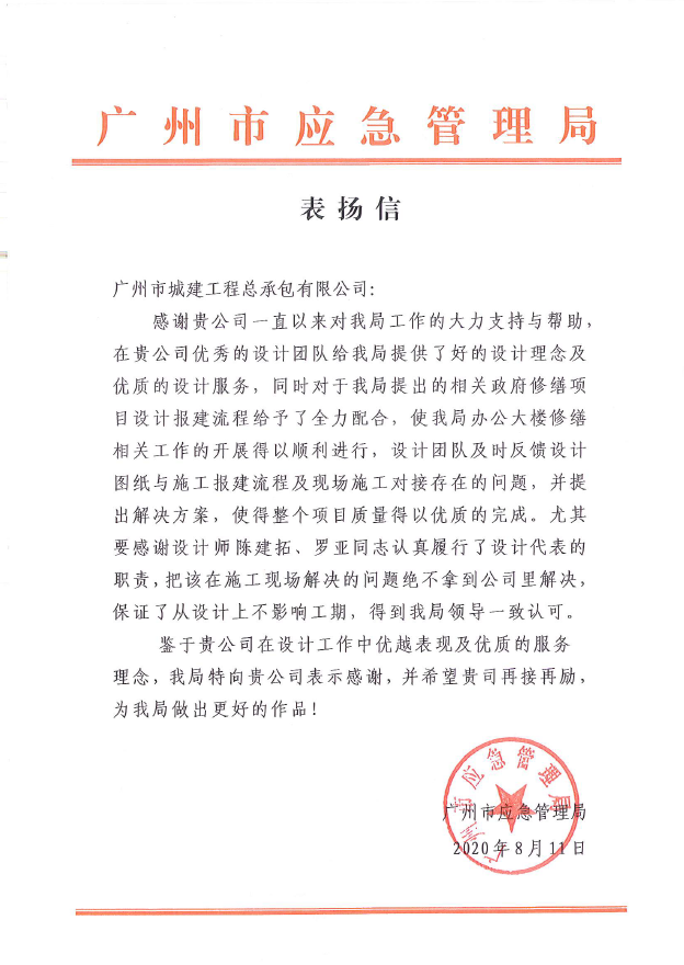 8月,廣州市應(yīng)急管理局向我公司發(fā)來表揚(yáng)信,對我公司為廣州市應(yīng)急管理局建設(shè)工作的支持表示衷心感謝和贊揚(yáng),其中對設(shè)計(jì)團(tuán)隊(duì)陳建拓、羅亞同志突出的工作表現(xiàn)給予高度評價。