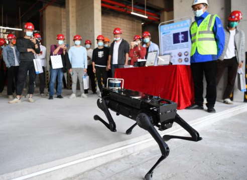 觀摩現(xiàn)場(chǎng)一只好動(dòng)的巡檢機(jī)器狗在跳來跳去,它能夠代替人工到施工現(xiàn)場(chǎng)進(jìn)行工地巡檢,分析危險(xiǎn)源,識(shí)別火焰、煙霧、人員未佩戴安全帽、未穿反光背心等情況,極大提高危險(xiǎn)作業(yè)區(qū)域巡視管理效率及安全性;抹灰機(jī)器人通過高效振動(dòng)和液壓提升,將砂漿平整的涂抹在墻面,解決高空作業(yè)及抹灰效能問題……