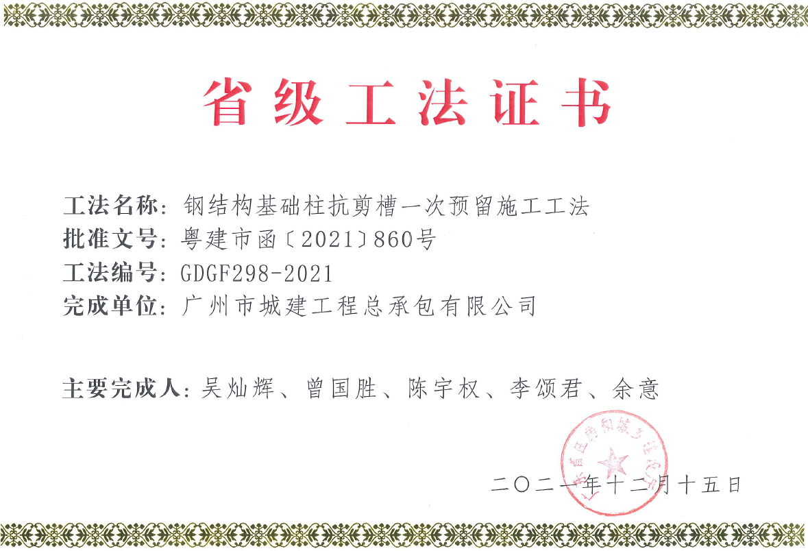 我公司的鋼結(jié)構(gòu)基礎(chǔ)柱抗剪槽一次預(yù)留施工工藝榮獲廣東省省級工法,并且授予實用新型專利。
