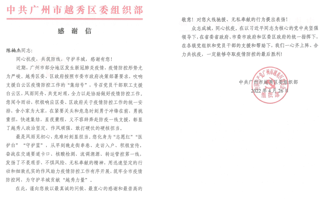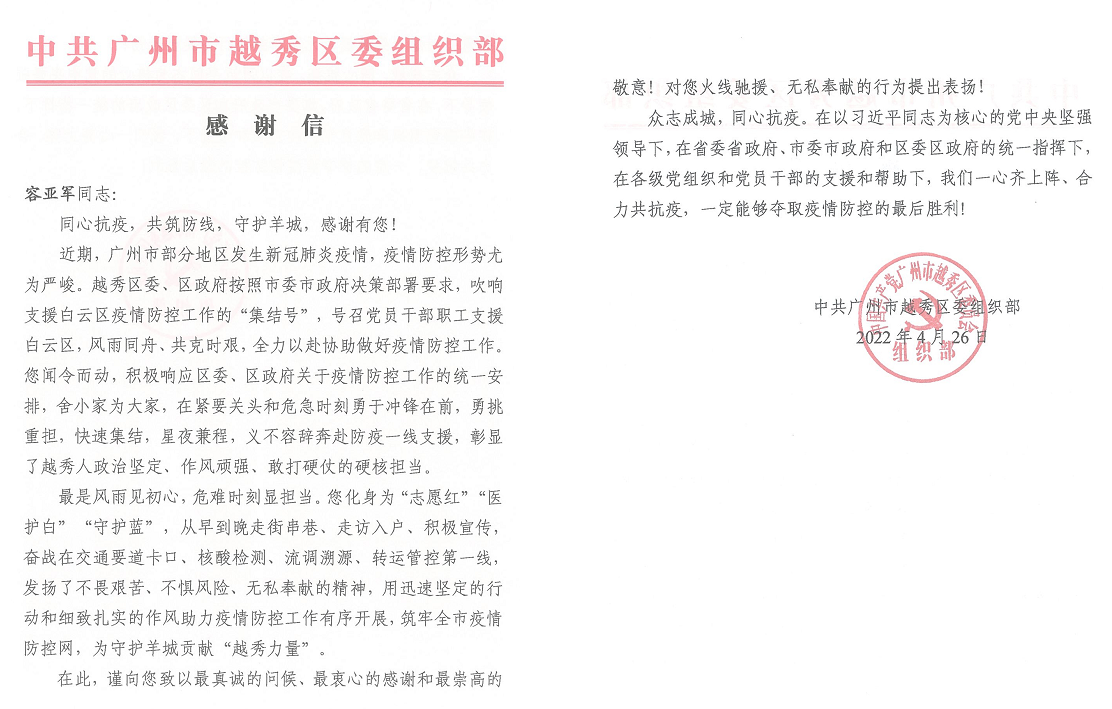 中共廣州市越秀區(qū)委組織部對公司支援白云區(qū)大朗村疫情防控工作的志愿服務(wù)人員容亞軍和陳楠杰同志,在緊要關(guān)頭沖鋒在前、快速集結(jié)、義不容辭的出色表現(xiàn)發(fā)來了感謝信。