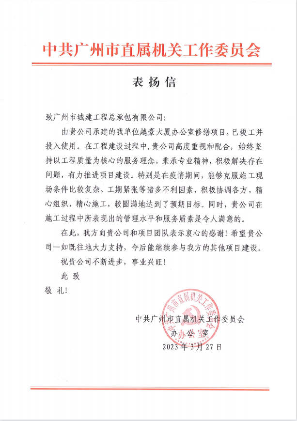 近日,中共廣州市直屬機關(guān)工作委員會向公司發(fā)來感謝信,為公司在克服施工條件復雜、工期緊張的情況下,順利完成市直機關(guān)辦公場所修繕項目表示肯定,并對公司及項目團隊表示衷心的感謝。