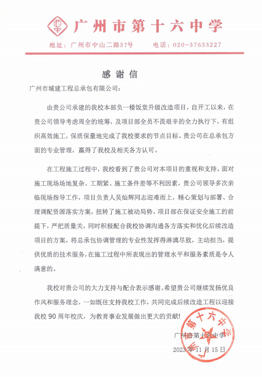 近期,公司陸續(xù)收到多個項目業(yè)主和配合單位發(fā)來的感謝信,黃埔區(qū)文沖街道辦-瑞東花園社區(qū)品質提升項目、十六中學-校本部飯?zhí)酶脑祉椖俊⒒ǘ汲噗桄?zhèn)政府-美麗圩鎮(zhèn)全過程咨詢項目、廣州市公安局打私隊-廣園中路805號大院室外地面及A棟用房修繕工程、廣州市公安局打私支隊2021-2022年度業(yè)務用房急修項目、四川蜀西地勘集團-肇慶歷史遺留礦山生態(tài)修復工程等參建單位對公司和項目參與成員所付出的工作表示肯定和感謝。對公司的項目團隊發(fā)揮不怕疲勞、持續(xù)作戰(zhàn)的職業(yè)精神,在高強度駐場工作中表現(xiàn)出的高度工作熱情、強烈工作責任心、扎實專業(yè)素養(yǎng)和嚴謹細致的工作態(tài)度給予贊揚。