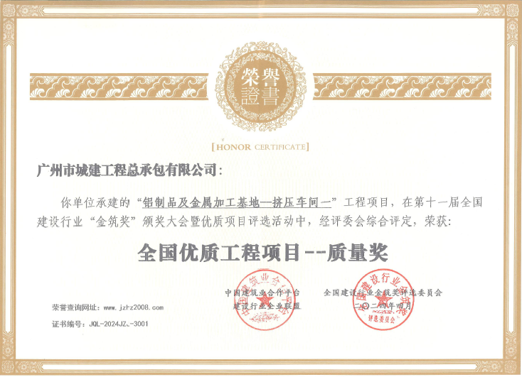 4月,公司積極參加全國建設(shè)行業(yè)“金筑獎”評選活動,經(jīng)綜合評定,由公司承建的新興鳳鋁公司鋁制品及金屬加工基地--擠壓車間一工程項目榮獲第十一屆“金筑獎”全國優(yōu)質(zhì)工程項目——質(zhì)量獎。