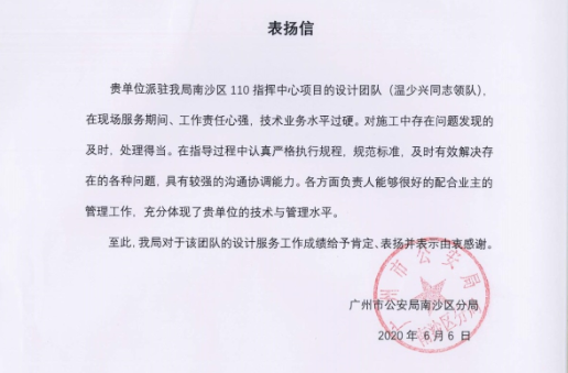近日,廣州市公安局南沙區(qū)分局送來表揚(yáng)信,對我公司廣州市南沙公安分局110指揮中心裝修設(shè)計工程的設(shè)計團(tuán)隊給予表揚(yáng)。 該項目設(shè)計時間緊、要求高,我公司在承接項目后,派駐專業(yè)設(shè)計團(tuán)隊全力開展項目設(shè)計任務(wù),積極...