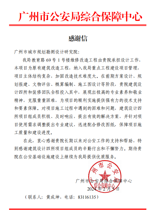 近日,廣州市公安局綜合保障中心發(fā)來感謝信,衷心感謝規(guī)劃院和我公司對教育路 69 號 1 號樓維修改造工程設(shè)計(jì)工作的支持,對我公司裝修設(shè)計(jì)團(tuán)隊(duì)在室內(nèi)方案設(shè)計(jì)及施工圖設(shè)計(jì)階段展現(xiàn)出的專業(yè)能力和敬業(yè)精神,保障了項(xiàng)目...