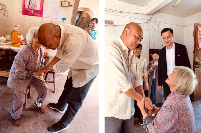 我們到78歲的萬(wàn)錦英老人家去慰問(wèn),她緊緊拉著院駐村扶貧干部蔡慶立同志的手,眼里充滿(mǎn)了感激之情。